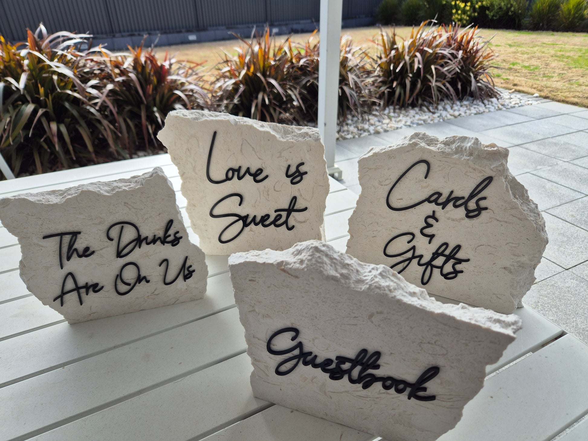 Limestone signs are sure to wow your guests no matter what the occasion. Whilst popular for weddings and engagements, they add luxury to any event. Each piece is unique in colour, shape and size. No two pieces will ever be the same. They are hand-made and paired with laser-cut acrylic lettering in a large range of different colours, adding the perfect touch to your event decor.